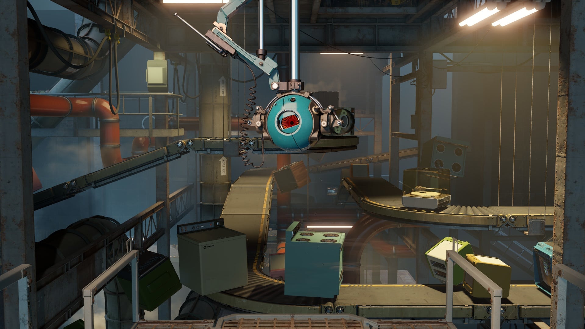 Obrázky ukazují, že obsluhujete stroje, máte na starosti výrobu některých předmětů, jako jsou toalety a pračky, a seznámíte se s robotem podobným Wheatleymu.