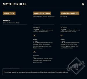 Mark Yetter, vedoucí herní designér Riot Games, oznámil na Twitteru, že pro každou kategorii šampionů budou tři až čtyři mýtické předměty. Alespoň dvě z těchto položek by měly vždy představovat platné strategické možnosti na hru.