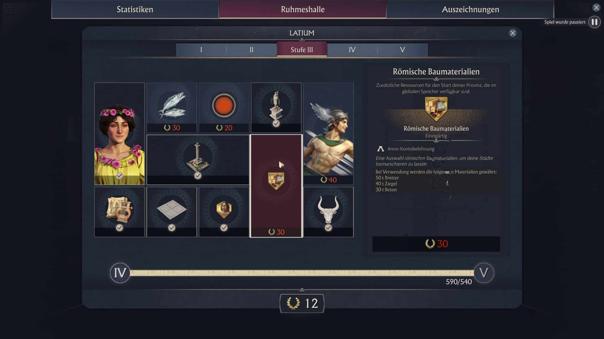 - Roman building materials: You immediately receive 50 boards, 40 bricks, and 30 concrete in your office. The concrete advantage in particular can be worthwhile.