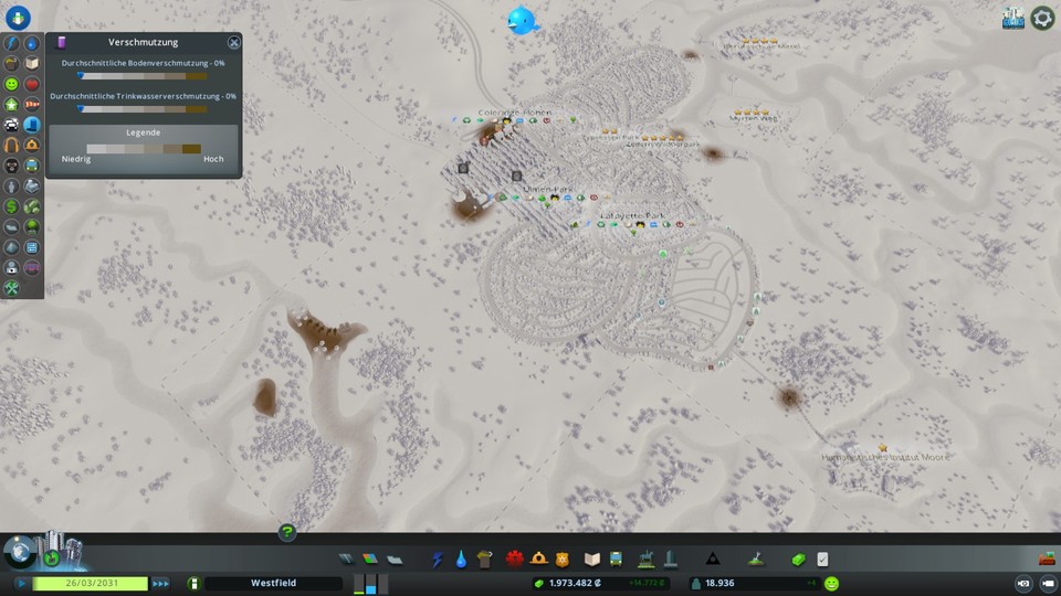 Motivated by our own ideals, we rely on green alternatives like wind power and eco-drainage pipes from the outset. This has advantages like less soil and water pollution, but gets us into real trouble financially. Organic – as in real life – is more expensive and as mayor we can’t afford to neglect the finances. In a flash, taxes are raised a little and the problem is out of the world for the time being. Apart from that, Green Cities works wonderfully: our city is noticeably quieter, cleaner and therefore happier.