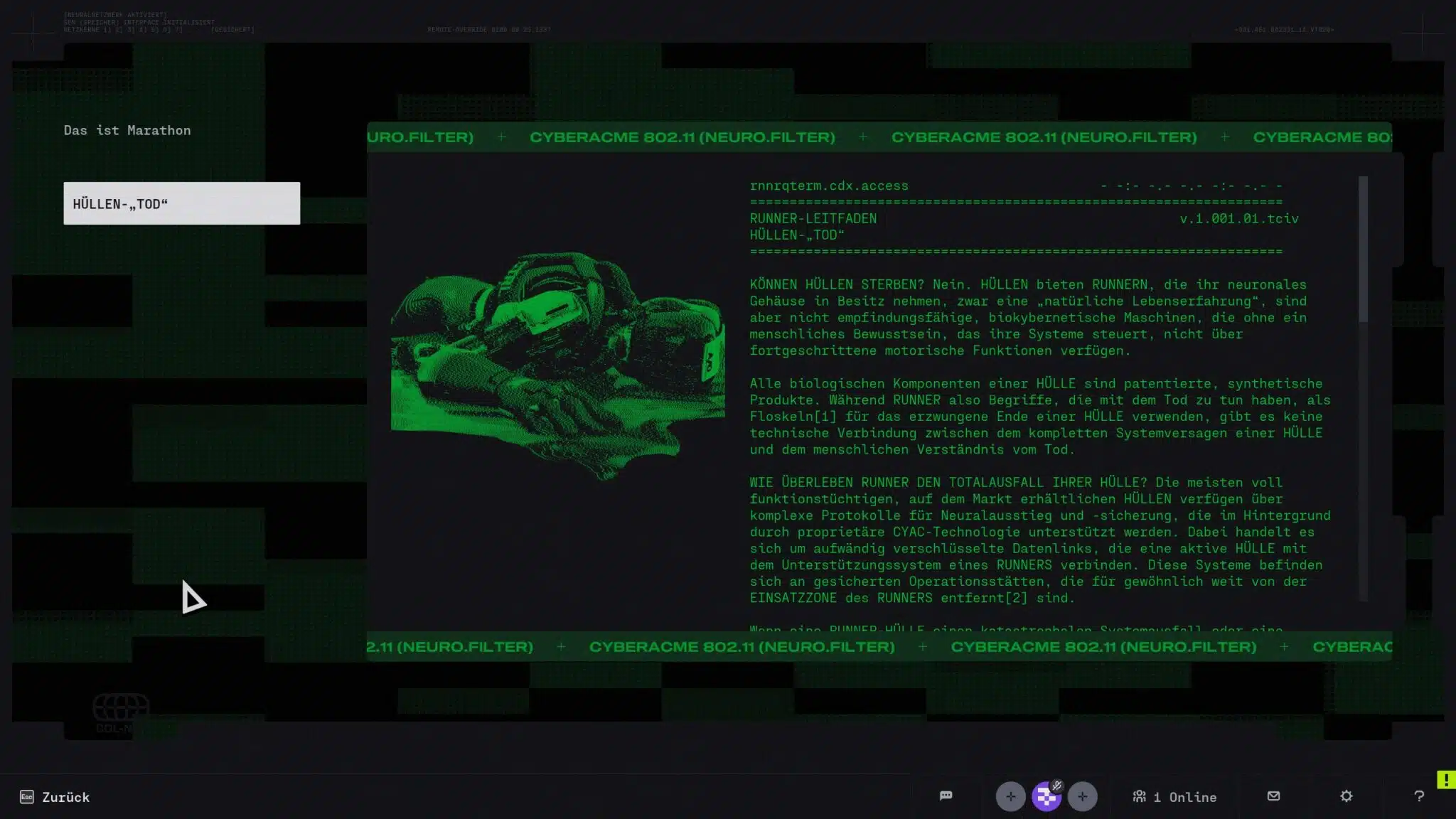 A concrete example: everything in Marathon that has to do with conveying information is a disaster. Many people will run away screaming within the first 20 minutes because of this. And I’m not just talking about the menus, but also the menus.