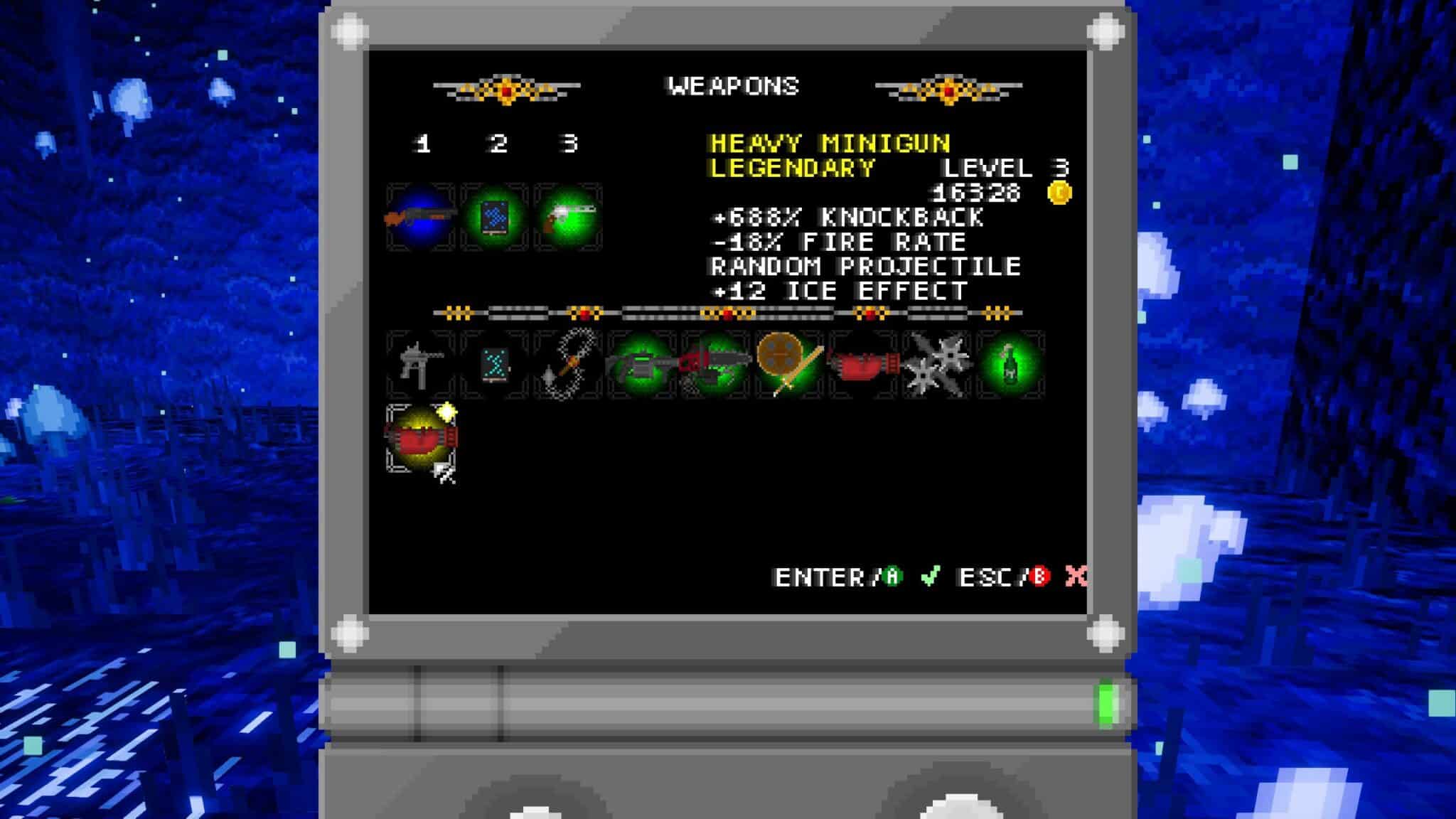 Once you have found the exit portal, the position of which can sometimes change due to the partly manual,partly random level generationyou cantake a weapon with you to the next level. ただし、強力すぎる小さな助っ人はバランスを損なわないようにグレーアウトされている。結局のところ、ミニガンは最後に16,000ゴールドコインをくれた。