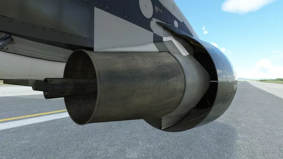 Во-вторых, внешний вид уже не соответствует современным требованиям — что особенно заметно в сравнении с прямым конкурентом, Fenix Airbus A320 (к которому я перейду позже). Просто посмотрите на вспомогательную силовую установку (APU), которая находится в задней части самолета. В то время как APU в Fenix A320 полностью смоделирован, в PMDG B737 на том же месте видна лишь размытая дыра.