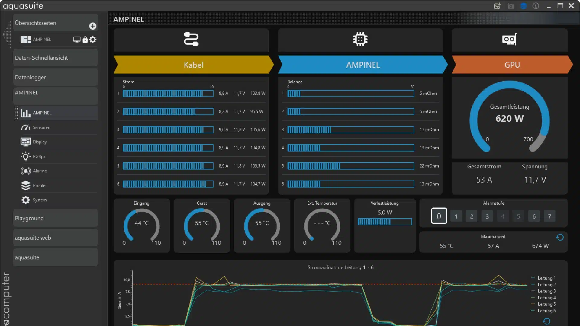 В инструменте под названием «Aquasuite» Ampinel также предоставляет вам дополнительные измеренные значения, например, мощность и температуру разъемов.