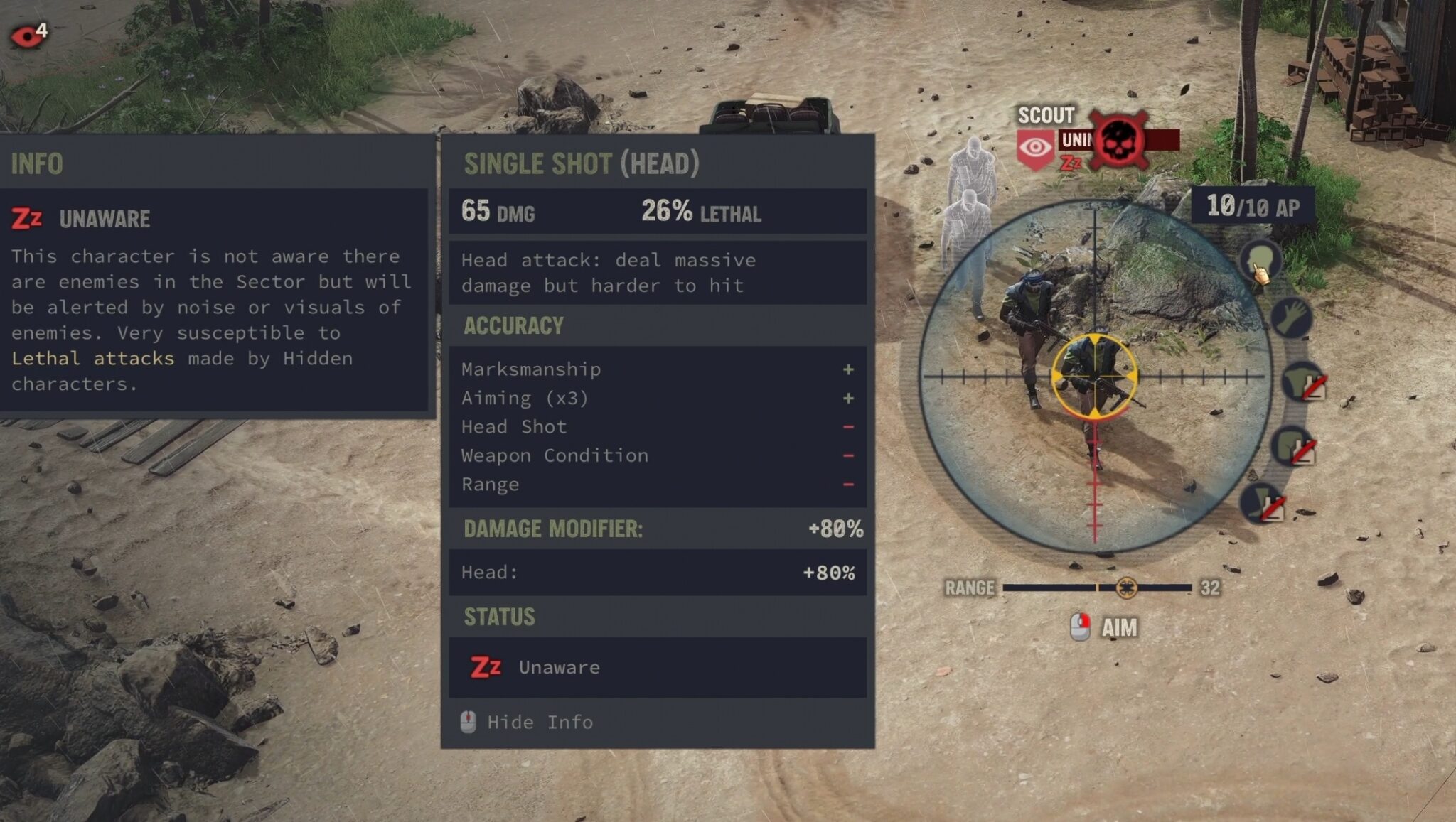瞄准系统又分为三个部分。你的目标是头部、躯干、手臂、腹部或腿部。五个身体部位以符号显示,前面的小符号表示身体部位是否穿戴了保护措施(如凯夫拉尔裤或头盔)和/或在掩护物后面。其次,根据武器的不同,你可以选择单发和连发。最后,你在瞄准方面投入行动点数–点数越多,击中的概率越高。开火!